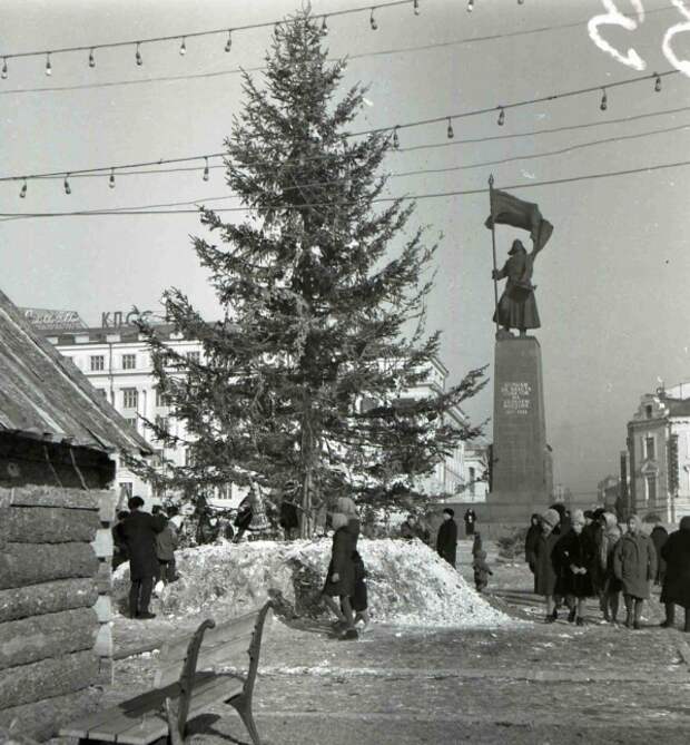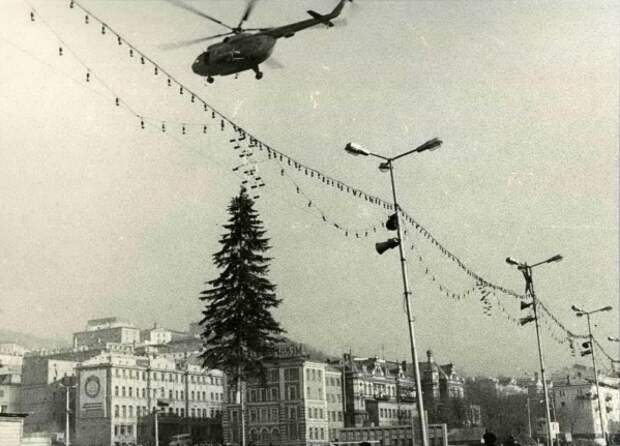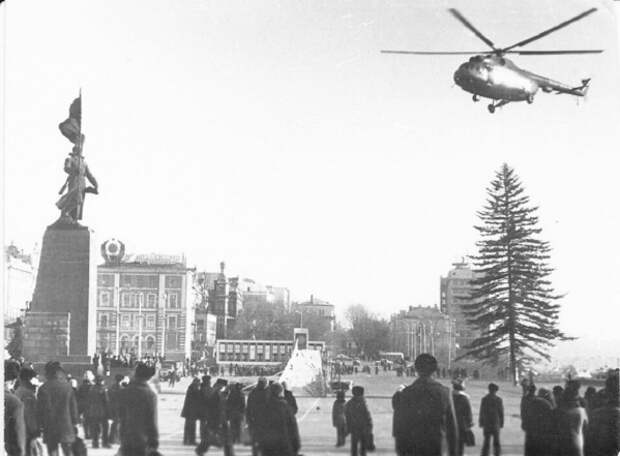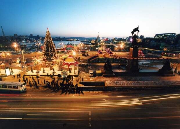 Елка над площадью, 1960–1980 годы В 60-е во Владивостоке к Новому году обязательно заливают катки и горки для детей. На центральной площади ставят елку – живую. А над площадью растягивали праздничные гирлянды. Кстати, елки на площадь еще очень долгие годы привозили прямиком из тайги – на вертолетах. Вокруг всегда работала ярмарка: новогодние игрушки и подарки продавали из разноцветных деревянных домиков. От живой елки к конусам Елки доставляли вертолетом до распада СССР. Площадь тоже украшали – в основном все было для детей. Например, в 80-е обязательно строили большую деревянную горку посреди площади.