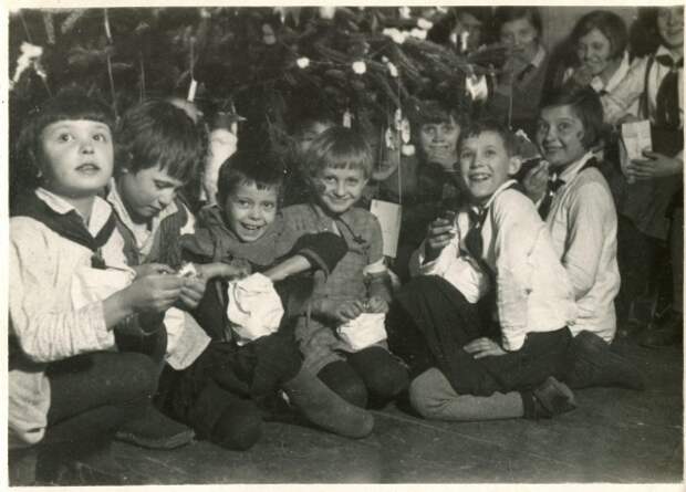 Средняя школа № 16. Новогодняя елка в здании бывшего «Епископского подворья», Владивосток, Седанка. 1957 год «Кроме того, каждый год матросы разыгрывали нечто вроде представления – и детям Владивостока тех лет оно казалось лучше любого театра! В соседнем помещении накрывались столы с угощением», – рассказала экскурсовод музея. Советские годы Праздники закончились в 20-е годы прошлого века. Советская власть, пытаясь запретить все религиозное, запретила и празднование Рождества, в немилость попали даже елки. Это продолжалось до 1935 года: тогда в газете «Правда» вышла заметка Постышева, который призвал организовать новогодние елки для советских детей – в школах, садах, детских домах, колхозах. Ни один ребенок не должен был остаться без праздника – нового, советского, без религиозных напоминаний.