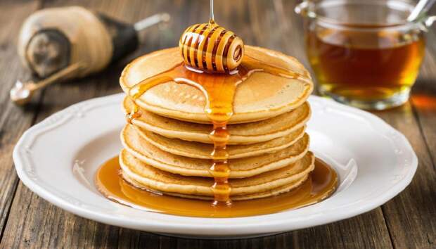 л. соды.Все ингредиенты смешивают, тесто оставляют на 15 минут. Оладьи жарят на сковороде и подают горячими, полив сверху медом.