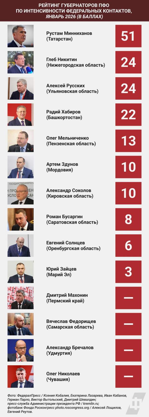 Кроме того, в январском активе Минниханова – встреча с замглавы МЧС России Романом Курыниным и участие главы Бурятии Алексея Цыденова в расширенном заседании итоговой коллегии минтранса Татарстана. Как известно, Цыденов является председателем комиссии Госсовета по направлению «Эффективная транспортная система». Высокая активность Никитина и Русских Второе место по интенсивности федеральных контактов по итогам первого месяца 2026 года поделили губернаторы Нижегородской и Ульяновской областей. 13 января Глеб Никитин в Москве обсудил развитие жилищного строительства в Нижегородской области с гендиректором ДОМ.РФ Виталием Мутко. 28 января столицу региона посетил замминистра просвещения России Владимир Желонкин. С Глебом Никитиным они осмотрели федеральный технопарк профессионального образования, который сейчас создается на базе имущественного комплекса «Нижполиграф». Уже на следующий день губернатор в Москве презентовал спикеру Совета Федерации Валентине Матвиенко и патриарху Кириллу нижегородскую выставку «Люди Церкви: история одного рода». Она работала в здании верхней палаты российского парламента во второй половине января и была приурочена к 80-летию предстоятеля РПЦ. Также 29 января Глеб Никитин тет-а-тет пообщался с Валентиной Матвиенко, рассказав ей о социально-экономическом развитии Нижегородской области.