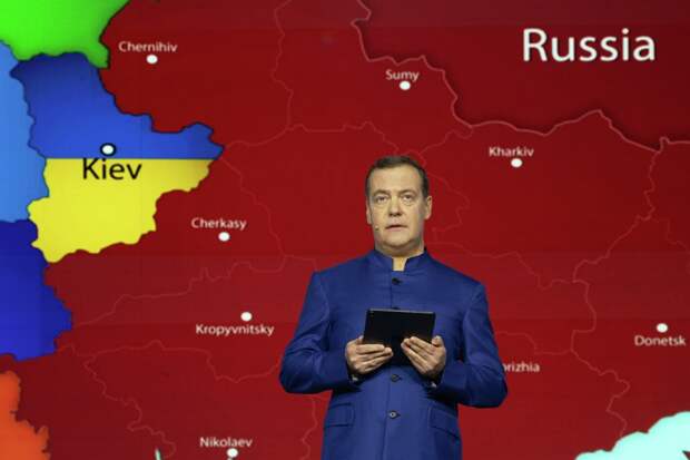 Кроме того, Медведев презентовал карту России и Украины, оставив «бандеровцам» только Киев, Винницу и Черновцы. Все остальные регионы должны вернуться в состав России. В частности, речь идет о: