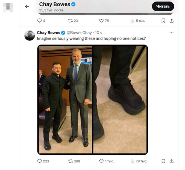 Ирландский журналист Чей Боуз обратил внимание на внешний вид Владимира Зеленского во время заседания Генассамблеи ООН. «Вы можете представить, что на полном серьезе надеваете вот это и надеетесь, что никто не обратит внимания?» – написал он в социальной сети X.По его мнению, бывший украинский комедиант, выбирая обувь для официального мероприятия, рассчитывал, что этот элемент гардероба останется без внимания.