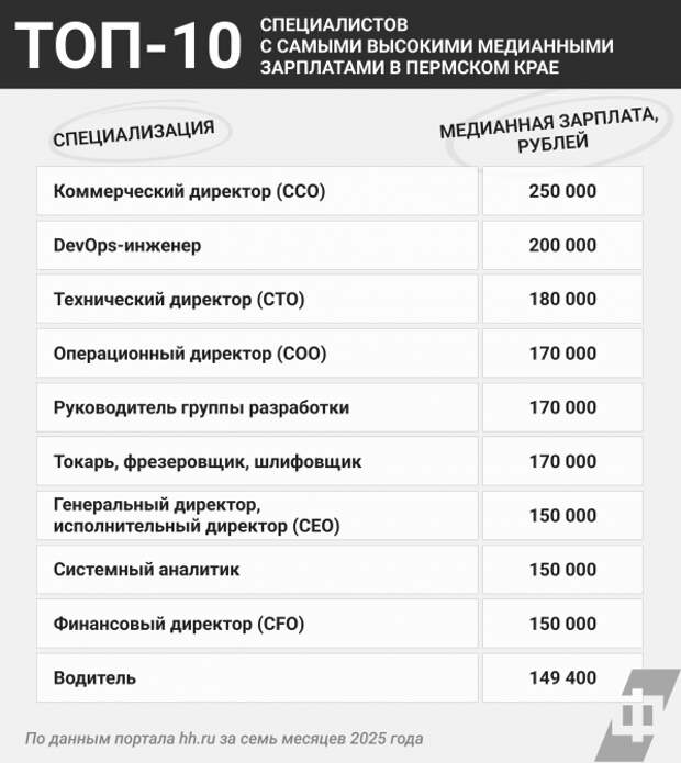 Кому готовы платить самые высокие зарплаты Самые высокие медианные зарплаты в этом году в Пермском крае предлагают таким специалистам, как коммерческий директор (250 тысяч рублей), DevOps-инженер (200 тысяч) и технический директор (180 тысяч).