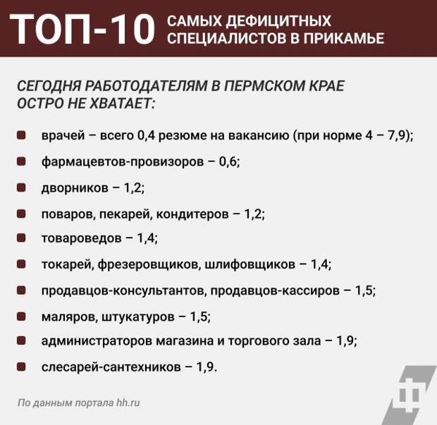 В нефтегазовой отрасли – в электромонтажниках, сварщиках, разнорабочих, а в телекоммуникациях и связи – операторов call-центра, менеджеров по продажам, продавцов-консультантов», – рассказала Оксана Сидлецкая.При этом самыми дефицитными в Прикамье являются другие специалисты. Сегодня работодателям в регионе крайне не хватает врачей (всего 0,4 резюме на вакансию при норме в 4 –7,9), фармацевтов-провизоров (0,6), дворников, поваров, пекарей, кондитеров (1,2).
