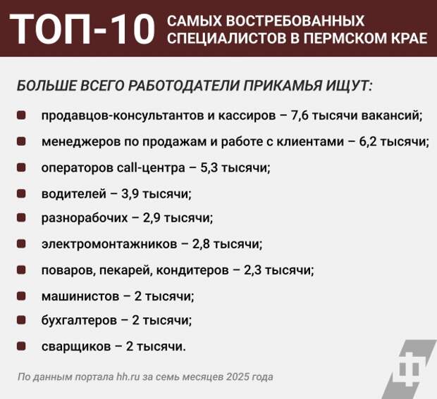 Здоровая конкуренция вместо гонки зарплат В целом, как отметила Оксана Сидлецкая, сегодня на рынке труда Пермского края наблюдается умеренная конкуренция – здоровое соотношение между работодателями и соискателями. «На одну вакансию в регионе приходится 5,5 резюме при норме в 4,0–7,9. При этом год назад наблюдался яркий дефицит кадров – 3,2 резюме на вакансию», – напомнила Сидлецкая. Сейчас дефицит кадров характерен, прежде всего, для сфер с массовым наймом. Самый острый кадровый голод, как уже было сказано выше, наблюдается в медицине и фармацевтике, где на одно предложение работодателя приходится всего 1,6 резюме кандидатов, и розничной торговле – 1,7. Также нехватка кадров ощущается на производстве, сервисном обслуживании (3,4), в строительстве и недвижимости (3,6), среди рабочего персонала (3,8). На нижней границе нормы находится конкуренция в продажах, обслуживании клиентов и в сельском хозяйстве – здесь приходится по 4 резюме на вакансию. Поэтому работодатели из этих сфер также могут испытывать сложности при поиске персонала. «Активность работодателей с конца 2024 года снижается в силу высокой ключевой ставки, сложных условий в экономике и геополитике. За семь месяцев этого года спрос на кадры уменьшился на 19 %, если сравнивать с таким же периодом 2024-го. А за последний месяц объем вакансий оказался на четверть ниже, чем годом ранее. При этом соискательская активность растет с прошлого года, когда мы наблюдали «гонку зарплат». Соискатели продолжают обновлять резюме и сегодня для мониторинга наиболее привлекательных предложений, а также поиска подработки. Кроме того, летом активнее выходит на рынок молодежь. С мая по июль ежемесячно активность соискателей была в среднем на 30 % выше, чем в 2024 году», – пояснила Оксана Сидлецкая. Ранее «ФедералПресс» подробно рассказывал о текущей ситуации на рынке труда в других регионах ПФО. В частности, большая аналитика была посвящена Нижегородской области: советуем почитать материал «Кто нужен заводам Нижнего Новгорода и сколько готовы платить: обзор вакансий». Также «ФедералПресс» писал, какие специалисты крайне востребованы и дефицитны в Башкирии, Самарской и Пензенской областях. Фото: ФедералПресс / Полина Зинвьева; инфографика: ФедералПресс / Маргарита Неклюдова