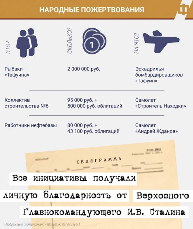Все для фронта: народная инициатива Помимо ударной работы, жители Находки активно участвовали в сборе средств для фронта. В марте 1943 года коллектив строительства № 6 собрал 95 тысяч рублей наличными и 500 тысяч рублей облигациями на строительство самолета «Строитель Находки». Год спустя, в марте 1944 года, работники местной нефтебазы внесли 80 тысяч рублей наличными и 43 180 рублей облигациями государственных займов на строительство боевого самолета «Андрей Жданов». Все эти инициативы получали личную благодарность от Верховного Главнокомандующего И. В. Сталина в ответных телеграммах.