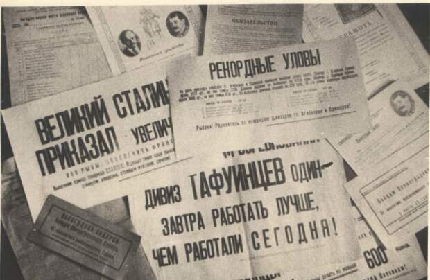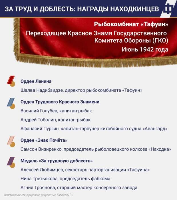 О трудовых подвигах находкинских рыбаков регулярно писала главная газета страны – «Правда». Уже 10 января 1942 года в статье «Инициатива советских патриоток» приводился призыв работниц «Тафуина» ко всем рыбакам Дальнего Востока: «Дадим стране, фронту тысячи дополнительных центнеров рыбы!». Этот призыв был подхвачен на других предприятиях Приморья. В апреле того же года «Правда» сообщала о подготовке «Тафуина» к путине и выпуске «сотен ящиков высококачественных консервов» и питательных концентратов для фронта. А в июне 1942 года комбинат выступил инициатором Всесоюзного социалистического соревнования, взяв обязательства значительно перевыполнить планы. Сквозь штормы и морозы Несмотря на осенние штормы 1942 года, рыбаки «Тафуина» не сбавляли темпов. Как писала «Правда» 24 октября, они обязались выловить к концу года сверх плана 23 600 центнеров рыбы. А в феврале 1943 года коллектив собрал 2 млн рублей на строительство эскадрильи бомбардировщиков «Тафуин». Уже в июле 1943 года газета сообщала о новом достижении: рыбаки досрочно выполнили годовой план, добыв вдвое больше рыбы, чем годом ранее. Они обязались выловить дополнительно еще 30 тысяч центнеров – это была не просто работа, это была настоящая клятва, которую они с честью выполнили. Высокие награды за трудовую доблесть Труд работников находкинских предприятий был по достоинству оценен государством. Уже в июне 1942 года рыбокомбинат «Тафуин» был удостоен высшей трудовой награды – Переходящего Красного Знамени Государственного Комитета Обороны. А 23 августа 1943 года Указом Президиума Верховного Совета СССР группа работников была награждена орденами и медалями. Директор рыбокомбината «Тафуин» Шалва Надибаидзе получил Орден Ленина. Капитаны-рыбаки Василий Голубев и Андрей Тоболин были удостоены Ордена Трудового Красного Знамени. Этой же награды удостоился капитан-гарпунер китобойного судна «Авангард» Афанасий Пургин. Председатель рыболовецкого колхоза «Находка» Самсон Визиренко был награжден Орденом «Знак Почета». Медалью «За трудовую доблесть» были отмечены секретарь парторганизации рыбокомбината «Тафуин» Алексей Любимцев, председатель фабкома Нина Третьякова и старший мастер консервного завода Агния Троянова.