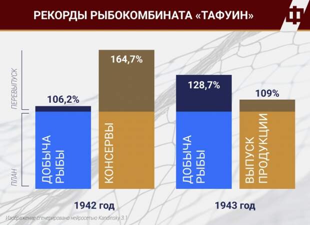 «Потрясает самоотверженный труд рыбников, приближавших заветный час освобождения. Боль и восхищение вызывает вера людей в победу, желание всеми силами способствовать освобождению страны от фашистского ига. При изучении материала поражала несгибаемая воля народа – откуда они черпали моральные и физические силы, чтобы брать на себя повышенные обязательства на очередную, даже маленькую победу на фронте, участвовать во всех гражданских инициативах, самим выходить с призывами дать больше рыбы стране, принимать участие в Военном Государственном займе, сборе средств на военную технику, одежду и подарки бойцам и блокадному Ленинграду, все жизненно необходимое для освобожденных районов. Словом, находиться в постоянном напряжении, радоваться победам на фронтах и в тылу, горевать о погибших. Кажется, нет предела человеческим силам, моральному духу и беззаветной любви к Родине. Каждый центнер рыбы был ударом по фашистам! Так была поставлена задача, и рыбники выполняли ее с честью», – поделилась одна из составителей книги Валентина Варрава. Рекорды «Тафуина»: цифры и факты Коллектив крупнейшего на Дальнем Востоке России рыбокомбината «Тафуин» в 1942 году выполнил план по добыче рыбы на 106,2 %, по выпуску консервов – на 164,7 %; в 1943 году – по лову на 128,7 %, по выпуску рыбной продукции – на 109 %. Эти цифры стали возможными благодаря самоотверженному труду работников.